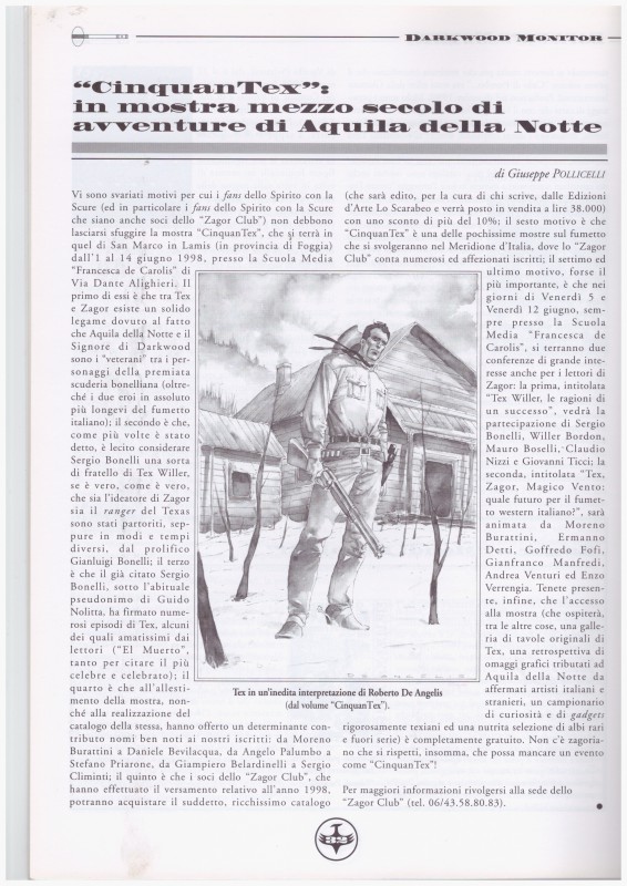 FANZINA EDITA PER I SOCI DELLO ZAGOR CLUB CONTIENE ARTICOLO DI GIUSEPPE POLLICELLI SULLA MOSTRA PER I " CINQUAN TEX "CHE SI TERRA' IN S. MARCO IN LAMIS ,AL CENTRO DISEGNO DI ROBERTO DE ANGELIS